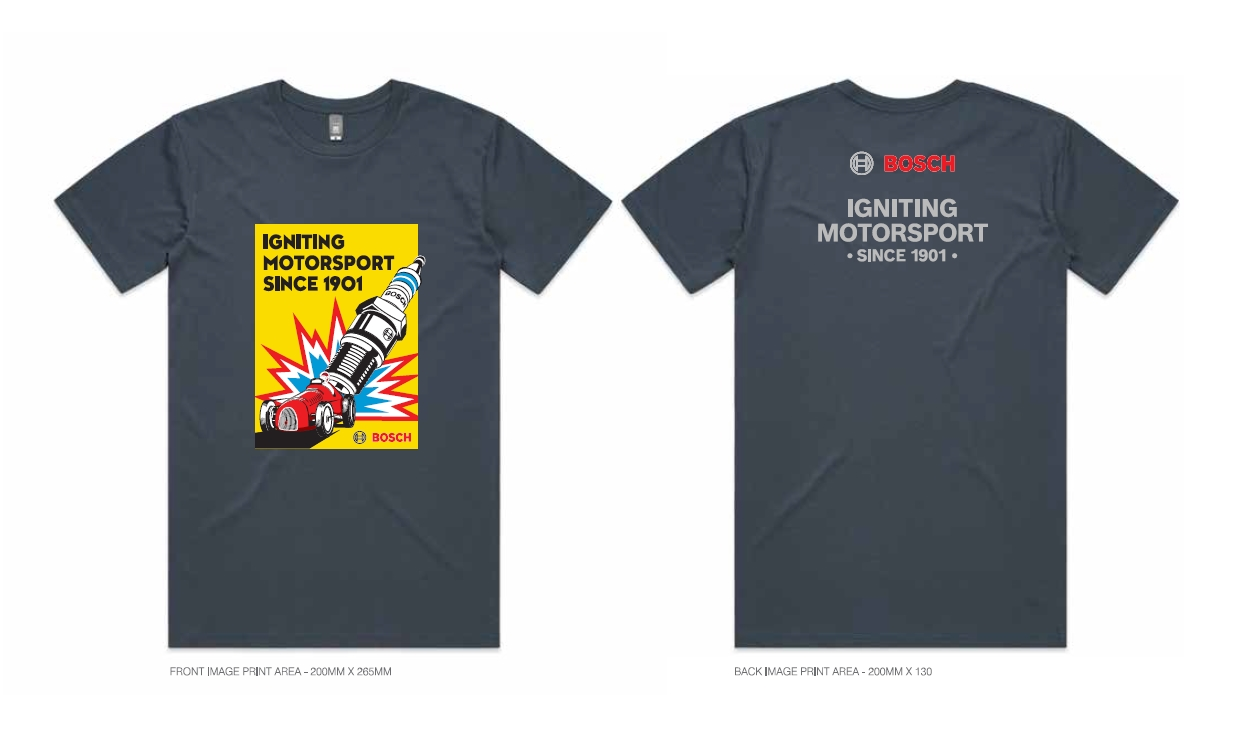 Bosch has been igniting motorsport since 1901. This commemorative t-shirt celebrates 120 years of Bosch's involvement in racing. The design, inspired by retro Bosch advertising posters, includes a spark plug and early formula style car. The print on the reverse includes the Bosch logo and "Igniting Motorsport Since 1901".